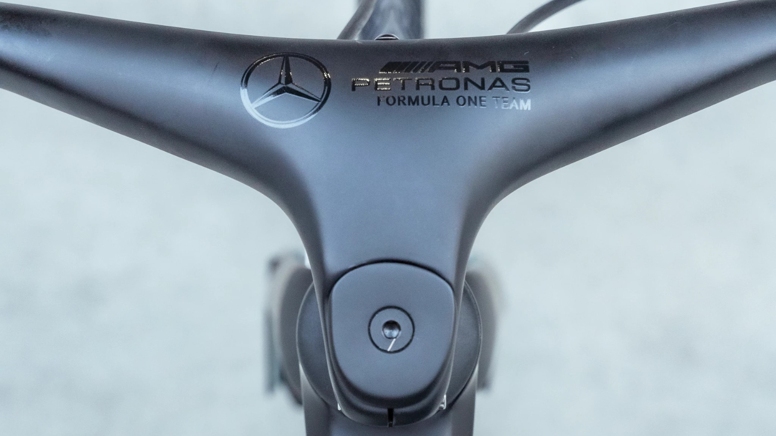 Les guidons plats en fibre de carbone Mercedes-AMG F1® avec câblage intégré permettent un positionnement confortable du pilote et une absorption des chocs sans rien gêner.